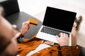 widok z góry wytatuowany kobieta trzyma kartę kredytową w pobliżu laptopa z pustym ekranem, smartfon, notebook z długopisem, i filiżanka kawy ze spodkiem na białym stole, nowoczesne miejsce pracy, praca z domu