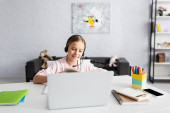 młoda kobieta z tatuażem na dłoni i grzywką trzymająca notatnik, w pobliżu smartfona z czystym ekranem i patrząca na laptopa na białym stole, rozmyty pierwszy plan, praca w domu
