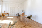 luksusowe wnętrze przestronnego mieszkania w starym XIX-wiecznym zabytkowym domu z nowoczesnymi meblami. wysoki sufit i ściany ozdobione są sztukaterią