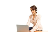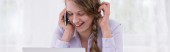uśmiechnięta młoda kobieta z grzywką siedząca w słuchawkach bezprzewodowych i trzymająca filiżankę kawy patrząc na niewyraźny laptop w domu, wolny strzelec, praca w domu, baner