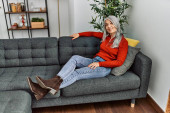 Zdjęcie "szczęśliwy tatuaż kobieta z blond i krótkie włosy, grzywka i okulary za pomocą laptopa podczas siedzenia na wygodnej kanapie obok smartfona i patrząc na aparat w pobliżu gitary w nowoczesnym salonie " może być wykorzystywane do celów osobistych i komercyjnych zgodnie z warunkami zakupionej licencji Royalty-free. Obraz jest dostępny do pobrania w jakości wysokiej rozdzielczości do 5760x3840.