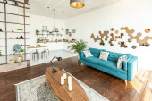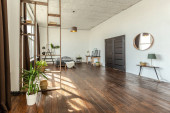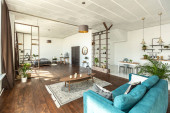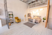 przestronny apartament typu studio ozdobiony drewnem i bielą. Minimalistyczny design z dużymi oknami w świetle słonecznym. kuchnia i część dzienna