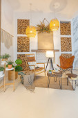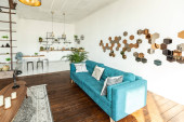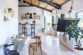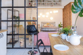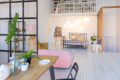 przestronny apartament typu studio ozdobiony drewnem i bielą. Minimalistyczny design z dużymi oknami w świetle słonecznym. kuchnia i część dzienna