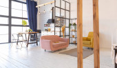 przestronny apartament typu studio ozdobiony drewnem i bielą. Minimalistyczny design z dużymi oknami w świetle słonecznym. kuchnia i część dzienna