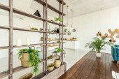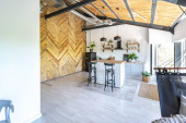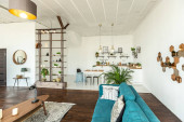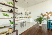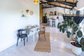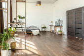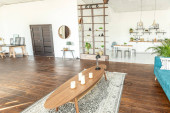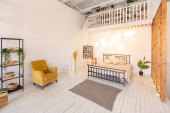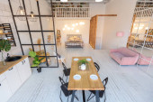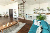 przestronny apartament typu studio ozdobiony drewnem i bielą. Minimalistyczny design z dużymi oknami w świetle słonecznym. kuchnia i część dzienna