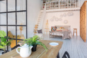przestronny apartament typu studio ozdobiony drewnem i bielą. Minimalistyczny design z dużymi oknami w świetle słonecznym. kuchnia i część dzienna