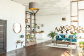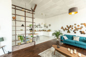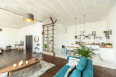 przestronny apartament typu studio ozdobiony drewnem i bielą. Minimalistyczny design z dużymi oknami w świetle słonecznym. kuchnia i część dzienna