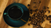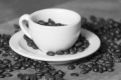 filiżankę espresso z ziarnem kawy na teksturowanym drewnianym stole. Klasyczna, romantyczna koncepcja kawy. przestrzeń kopiowania