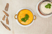 Foul mashes fasola fava z cytryną i chlebem serwowane w danie izolowane na czerwonej macie widok na góry na stole arabskiej żywności