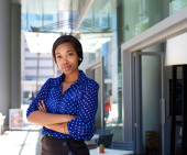 Pewni młody biznes czarny kobieta uśmiechając się na zewnątrz