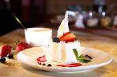 sernik pistacjowy z jagodami na talerzu w restauracji.