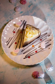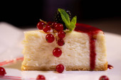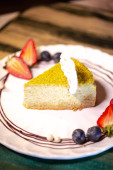 sernik pistacjowy z jagodami na talerzu w restauracji.