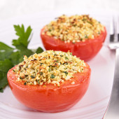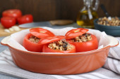 Pyszne pomidory z mieloną wołowiną, bulwą i grzybami na białym marmurowym stole, zbliżenie