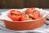 Zdjęcie "Pyszne pomidory z mieloną wołowiną, bulwą i grzybami na białym marmurowym stole, zbliżenie" może być wykorzystywane do celów osobistych i komercyjnych zgodnie z warunkami zakupionej licencji Royalty-free. Obraz jest dostępny do pobrania w jakości wysokiej rozdzielczości do 5760x3840.