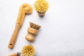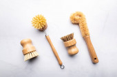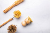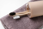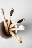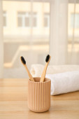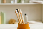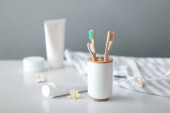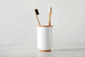 Uchwyt z bambusowymi szczoteczkami do zębów na białym stole
