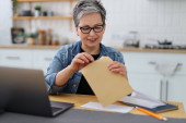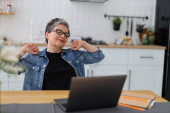 Zdjęcie "Dojrzała kobieta w okularach rozciąga się przy stole z laptopem." może być wykorzystywane do celów osobistych i komercyjnych zgodnie z warunkami zakupionej licencji Royalty-free. Obraz jest dostępny do pobrania w jakości wysokiej rozdzielczości do 5760x3840.