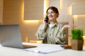 Zdjęcie "Kobieta w biurze rozmawia przez telefon z folderem w rękach w miejscu pracy, omawiając szczegóły umowy.." może być wykorzystywane do celów osobistych i komercyjnych zgodnie z warunkami zakupionej licencji Royalty-free. Obraz jest dostępny do pobrania w jakości wysokiej rozdzielczości do 5760x3840.