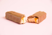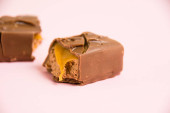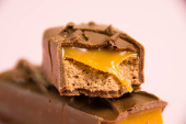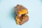 Apetyczne kawałki czekolady z karmelowym makro na niebieskim tle.