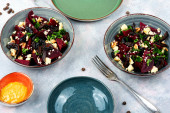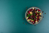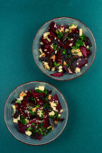 Świeża sałatka z buraków, orzechów i sera na talerzu. Przestrzeń kopiowania.