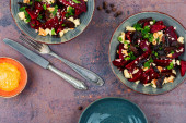 Zdjęcie "Świeża sałatka z buraków, orzechów i sera na talerzu. Przestrzeń kopiowania." może być wykorzystywane do celów osobistych i komercyjnych zgodnie z warunkami zakupionej licencji Royalty-free. Obraz jest dostępny do pobrania w jakości wysokiej rozdzielczości do 5760x3840.