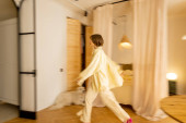 Stylowe studio apartament wnętrze w beżowe odcienie z ruchu zamazane kobieca postać spaceru