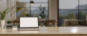 Widok z boku, biały tablet makieta ekranu na blatu kuchennym przy oknie ze świeżych warzyw, deska do krojenia, umywalka i wystrój. Domowa koncepcja gotowania. 3d renderowanie, ilustracja 3d
