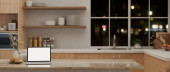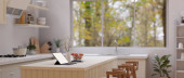 Zdjęcie "Widok z boku, biały tablet makieta ekranu na blatu kuchennym przy oknie ze świeżych warzyw, deska do krojenia, umywalka i wystrój. Domowa koncepcja gotowania. 3d renderowanie, ilustracja 3d" może być wykorzystywane do celów osobistych i komercyjnych zgodnie z warunkami zakupionej licencji Royalty-free. Obraz jest dostępny do pobrania w jakości wysokiej rozdzielczości do 5760x3840.