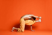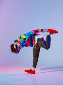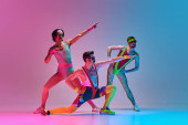 Zdjęcie "Szczęśliwa, uśmiechnięta, artystyczna, piękna para, mężczyzna i kobieta w stylowych ubraniach tańczących na gradientowym różowym żółtym tle. Koncepcja stylu retro, tańca, mody, sztuki, hobby, muzyki, lat 70." może być wykorzystywane do celów osobistych i komercyjnych zgodnie z warunkami zakupionej licencji Royalty-free. Obraz jest dostępny do pobrania w jakości wysokiej rozdzielczości do 5760x3840.
