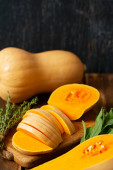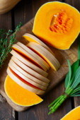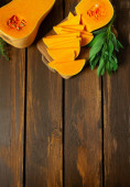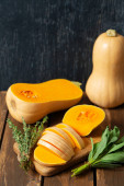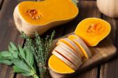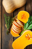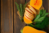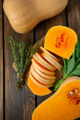 Świeża dynia z tymiankiem i szałwią na drewnianej powierzchni. Dynia z orzechami. Koncepcja zdrowej żywności. Widok z góry.