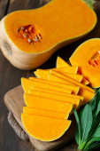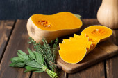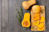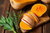 Zdjęcie "Świeża dynia z tymiankiem i szałwią na drewnianej powierzchni. Dynia z orzechami. Koncepcja zdrowej żywności. Widok z góry." może być wykorzystywane do celów osobistych i komercyjnych zgodnie z warunkami zakupionej licencji Royalty-free. Obraz jest dostępny do pobrania w jakości wysokiej rozdzielczości do 5760x3840.