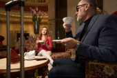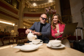 Zdjęcie "Szczęśliwy przystojny mężczyzna z brodą cieszący się kolacją z atrakcyjną zabawną kobietą, para śmiech, pierwsza randka, widok z tyłu" może być wykorzystywane do celów osobistych i komercyjnych zgodnie z warunkami zakupionej licencji Royalty-free. Obraz jest dostępny do pobrania w jakości wysokiej rozdzielczości do 5760x3840.