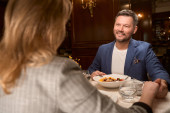 Szczęśliwy przystojny mężczyzna z brodą cieszący się kolacją z atrakcyjną zabawną kobietą, para śmiech, pierwsza randka, widok z tyłu