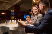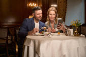 Szczęśliwa para właśnie wyszła za mąż jedząc obiad w lobby-barze i oglądając nowe zdjęcia ślubne na smartfonie, bawiąc się, przyjemnie wspominając