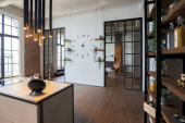 nowoczesny luksusowy design brutalnego wnętrza mieszkania z łukami w stylu średniowiecznego zamku z jasnymi akcentami. bezpłatny układ, aneks kuchenny, część wypoczynkowa i jadalna.