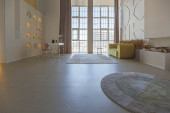 nowoczesny luksusowy design brutalnego wnętrza mieszkania z łukami w stylu średniowiecznego zamku z jasnymi akcentami. bezpłatny układ, aneks kuchenny, część wypoczynkowa i jadalna.
