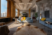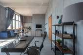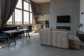 nowoczesny luksusowy design brutalnego wnętrza mieszkania z łukami w stylu średniowiecznego zamku z jasnymi akcentami. bezpłatny układ, aneks kuchenny, część wypoczynkowa i jadalna.