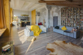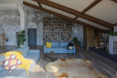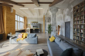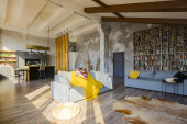 nowoczesny luksusowy design brutalnego wnętrza mieszkania z łukami w stylu średniowiecznego zamku z jasnymi akcentami. bezpłatny układ, aneks kuchenny, część wypoczynkowa i jadalna.