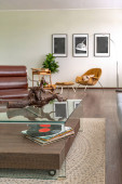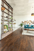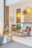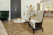 nowoczesny luksusowy design brutalnego wnętrza mieszkania z łukami w stylu średniowiecznego zamku z jasnymi akcentami. bezpłatny układ, aneks kuchenny, część wypoczynkowa i jadalna.