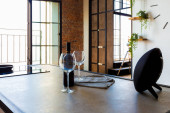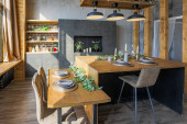nowoczesny luksusowy design brutalnego wnętrza mieszkania z łukami w stylu średniowiecznego zamku z jasnymi akcentami. stylowa szara kuchnia z wyspą do gotowania lub spędzania czasu