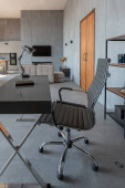 nowoczesny luksusowy design brutalnego wnętrza mieszkania z łukami w stylu średniowiecznego zamku z jasnymi akcentami. bezpłatny układ, aneks kuchenny, część wypoczynkowa i jadalna.