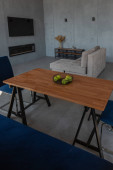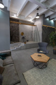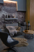 nowoczesny luksusowy design brutalnego wnętrza mieszkania z łukami w stylu średniowiecznego zamku z jasnymi akcentami. bezpłatny układ, aneks kuchenny, część wypoczynkowa i jadalna.