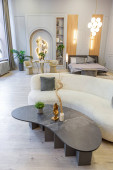nowoczesny luksusowy design brutalnego wnętrza mieszkania z łukami w stylu średniowiecznego zamku z jasnymi akcentami. bezpłatny układ, aneks kuchenny, część wypoczynkowa i jadalna.
