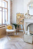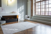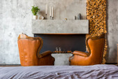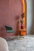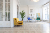 nowoczesny luksusowy design brutalnego wnętrza mieszkania z łukami w stylu średniowiecznego zamku z jasnymi akcentami. bezpłatny układ, aneks kuchenny, część wypoczynkowa i jadalna.