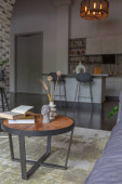 nowoczesny luksusowy design brutalnego wnętrza mieszkania z łukami w stylu średniowiecznego zamku z jasnymi akcentami. bezpłatny układ, aneks kuchenny, część wypoczynkowa i jadalna.