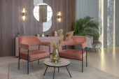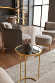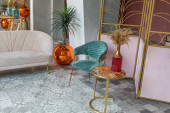 nowoczesny luksusowy design brutalnego wnętrza mieszkania z łukami w stylu średniowiecznego zamku z jasnymi akcentami. bezpłatny układ, aneks kuchenny, część wypoczynkowa i jadalna.