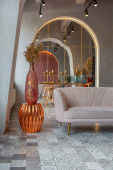 Zdjęcie "nowoczesny luksusowy design brutalnego wnętrza mieszkania z łukami w stylu średniowiecznego zamku z jasnymi akcentami. bezpłatny układ, aneks kuchenny, część wypoczynkowa i jadalna." może być wykorzystywane do celów osobistych i komercyjnych zgodnie z warunkami zakupionej licencji Royalty-free. Obraz jest dostępny do pobrania w jakości wysokiej rozdzielczości do 5760x3840.