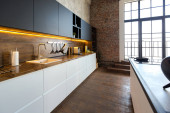 nowoczesny luksusowy design brutalnego wnętrza mieszkania z łukami w stylu średniowiecznego zamku z jasnymi akcentami. stylowa szara kuchnia z wyspą do gotowania lub spędzania czasu