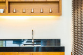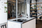 nowoczesny luksusowy design brutalnego wnętrza mieszkania z łukami w stylu średniowiecznego zamku z jasnymi akcentami. stylowa szara kuchnia z wyspą do gotowania lub spędzania czasu