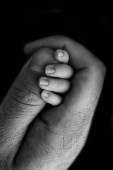 Zbliżenie małej dłoni dziecka i ręki matki i ojca. Noworodek po urodzeniu mocno się trzyma, ściska kciuk rodziców. Czarno-białe fotografie na czarnym tle.