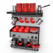 Zestaw naczyń kuchennych, garnek, patelnia i chromowane naczynia wiszące na półce i kuchenka elektryczna lub gazowa z płonącymi płomieniami na białym tle. 3d przygotowanie i gotowanie żywności